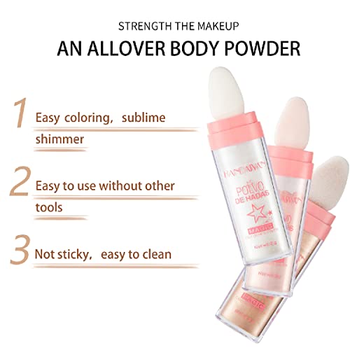 Polvo De Hadas Highlighter Puff Stick: Our Polvo De Hadas comes in 3 colors: white, golden brown, and pink. You can use highlighter powder individually or use different colors on different parts of your body for a unique shimmering look.