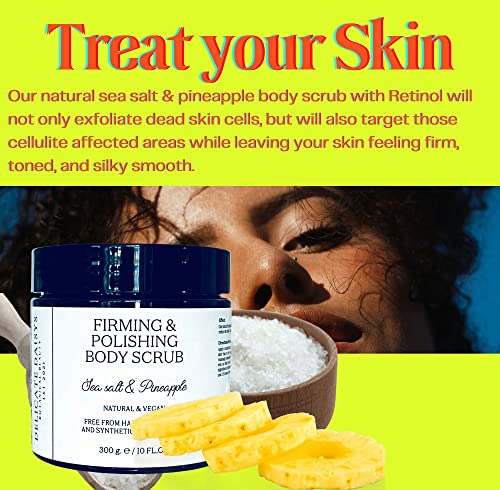 Our Pineapple Body Scrub with Retinol is a skin savior for dull skin. It harnesses the pineapple-derived enzyme bromelain & sea salt to buff away dirt and debris naturally while refining your skins appearance. It will also polish and balance your skin tone for bouncy, radiant, refreshing results.