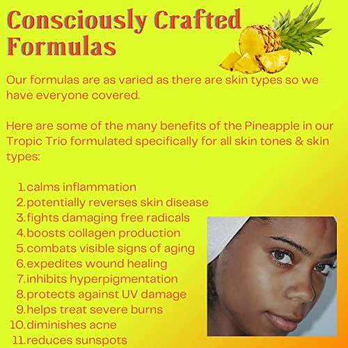 Target those cellulite affected areas and reduce skin imperfections with Delicate Daisys Botanical Beauty Tropic Trio Bundle. After one use, your skin will feel firm, toned and silky. The subtle scent of succulent pineapple will have you imagining you are in the tropics in no time. Not only will you smell delicious, but pineapple plays an important role in the stimulation and production of collagen, a protein matrix that provides your skin its structure while retaining its ability to be malleable & looking youthful. Pineapple also offers antioxidant-rich bromelain, high concentration of AHAs (Alpha Hydroxy Acids) and vitamin C, which will aid in the fight against free radicals and in the prevention of sun damage while lightening existing dark spots naturally. Pineapple is packed with minerals which also help enhance the health of your skin all while giving you the ultimate all over glow. All of the Delicate Daisys Botanical Beauty skincare products are designed as an indulgent experience that leaves you & your skin feeling luxurious. We ethically & sustainably source all the ingredients in our skincare products and most importantly, they are completely plant-based. We also guarantee 100% cruelty-free, certified by “The Leaping Bunny”, & “Cruelty-Free Kitty” & green practices, never testing on animals & with no harm caused to the environment. We are also MWBE Certified, therefore shopping with us means you are also supporting a minority, woman-owned business.