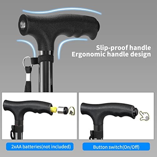 Walking Cane with LED Light: Built in LED light at the front of the handle, which can illuminate the front in dark places. Improve the safety of walking. (2x AA batteries not included).