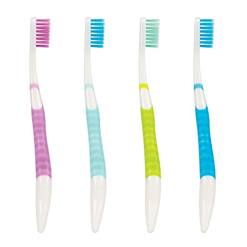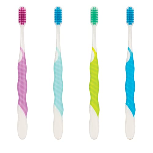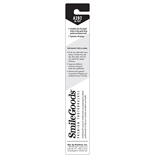 The SmileGoods A282 Toothbrush features an ergonomic, soft gel grip. 28 tufts of soft, extended-reach, fine tipped bristles to clean gently along gumline and between teeth. Packaged in blister packs. Assorted colors. 72 per box.