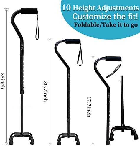 Quad Walking Cane Foldable Adjustable Portable Stick Men & Women and Seniors Lightweight & Sturdy with 4-Pronged Base for Extra Stability Balance,Self Standing Gifts for mom Dad (Black)