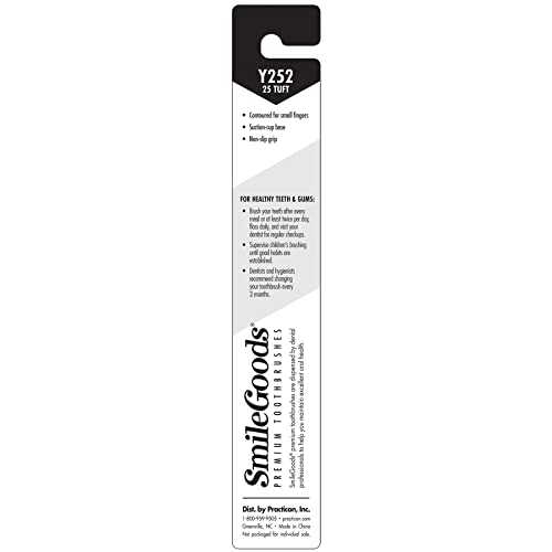 Each SmileGoods Y252 Toothbrush features: 25 tufts of soft, gentle bristles Non-slip grip contoured for small fingers Suction-cup base Packaged in blister packs. Assorted colors. 72 per box.